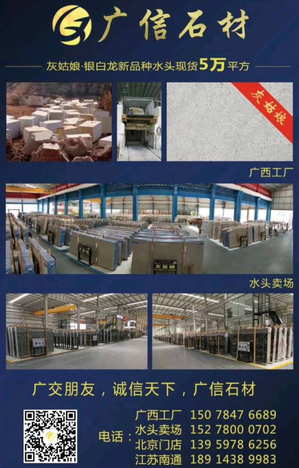 廣信石材有限公司是一家集開(kāi)采生產(chǎn),加工,銷售于一體的民營(yíng)企業(yè),主要經(jīng)營(yíng)天然大理石:灰姑娘,地中?;遥ù蟀?,條板,規(guī)格板),雅士灰,銀白龍,小米灰,美尼斯灰,新古堡灰,南極灰等各類天然大理石石材。主要銷往以色列,歐美,韓國(guó)以及國(guó)內(nèi)工程。礦山廠家直銷,廣西工廠,福建水頭,河北香河,江蘇南通均有銷售點(diǎn),歡迎您來(lái)我們直銷店或則廣西工廠實(shí)地考察參觀選購(gòu)。