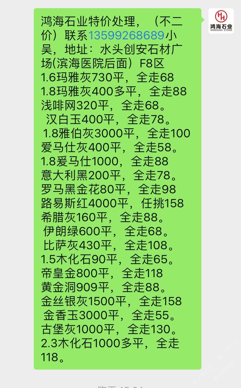 鴻海石業(yè)-現(xiàn)板5萬平特價處理,(不二價)聯(lián)系13599268689小吳,地址:水頭創(chuàng)安石材廣場(濱海醫(yī)院后面)F8區(qū) 1.8絲綢白3000平,150起 1.8金絲銀灰7500平,100起1.8夢幻藍4500平,100起。1.8卡拉垃白一150元起。 1.8藍色星球1300平,150起水墨年華6000平全走78。 1.8午夜星河1300平,150起1.8多蘭戈(紅色)300平,柏斯高灰2000平,全走88 新瑪雅灰3500平,全走88 1.5瑪雅灰200多平,全走68 星塵灰400平,全走88。 愛馬仕灰7500平,全走78 羅馬黑金花60平,全走88 黃金洞909平,全走88。 金香玉300平,全走50。 古堡灰1000平,全走99。 云海灰900多平全走128。2.3木化石100平,全走128。