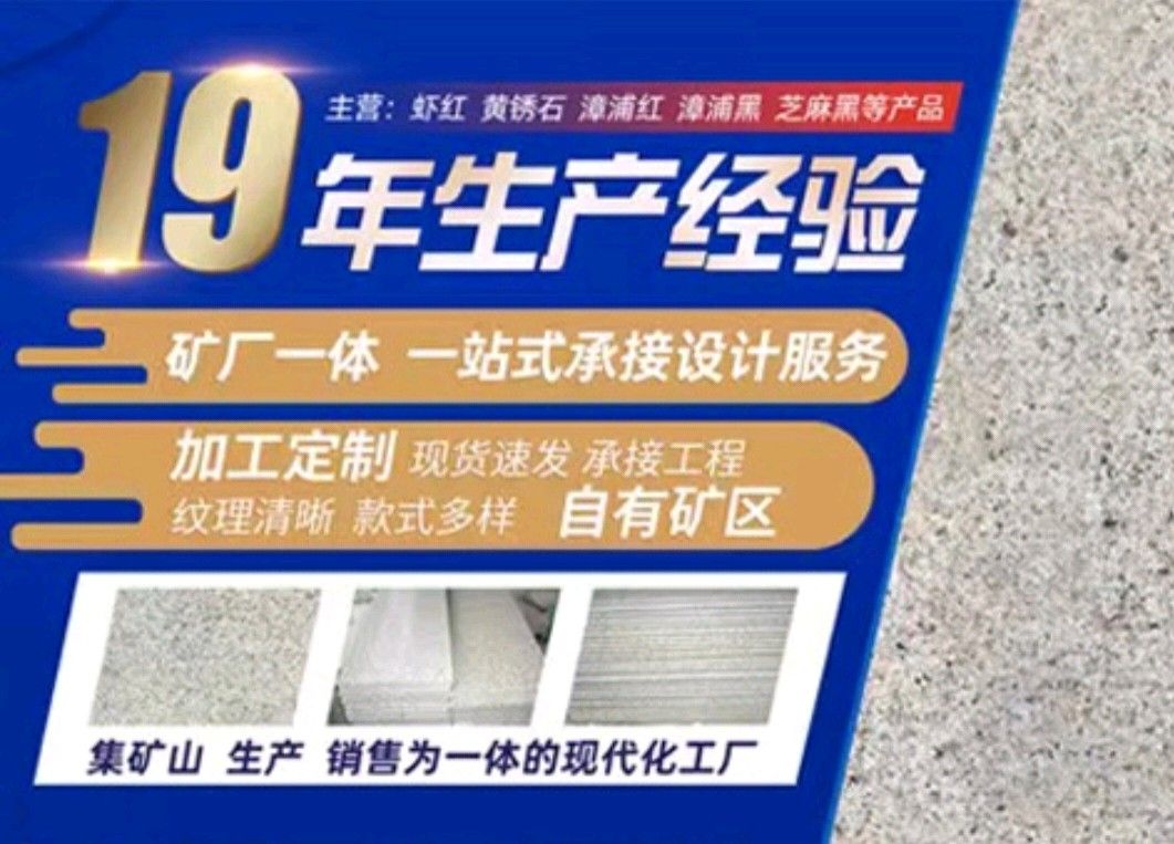 漳浦縣鴻勝石材有限公司是一家集礦山開采、自營加工生產(chǎn)、自主產(chǎn)供銷為一體的石業(yè)公司,公司擁有數(shù)家生產(chǎn)基地、手工加工場、大型礦山。公司創(chuàng)業(yè)歷程10年,憑著豐富的加工生產(chǎn)經(jīng)驗、雄厚的技術(shù)力量和先進的設(shè)備,產(chǎn)品遠銷歐美、韓國、新加坡、臺灣等地,深受客戶的信賴與好評。 本公司產(chǎn)品主要有: 漳浦紅,漳浦黑,漳浦青,漳浦蝦紅,漳浦銹石,福建青,安山巖,芝麻黑,芝麻灰,沙漠棕等。