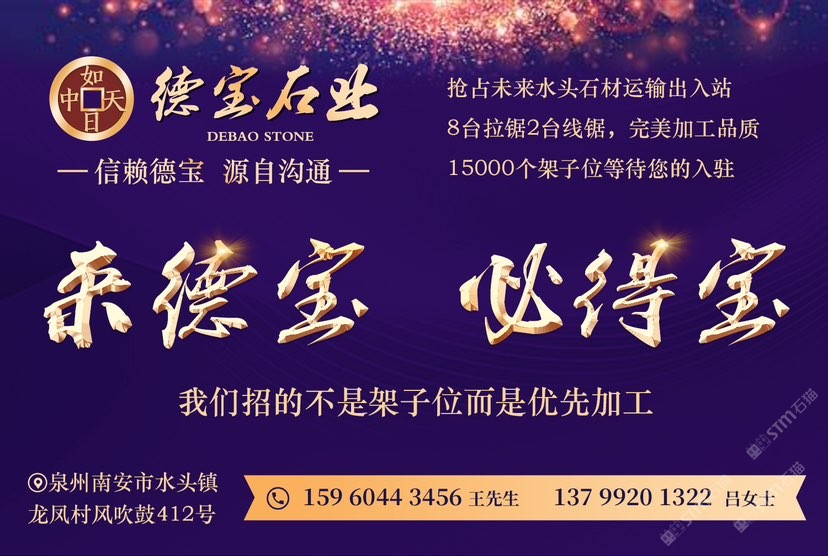 德寶大理石專業(yè)加工各規(guī)格大板,8臺拉鋸2臺線鋸,配備15000個架子位,是一家集加工、市場、展示為一體的二十多年老牌石企,嚴控出品質(zhì),歡迎來料加工!