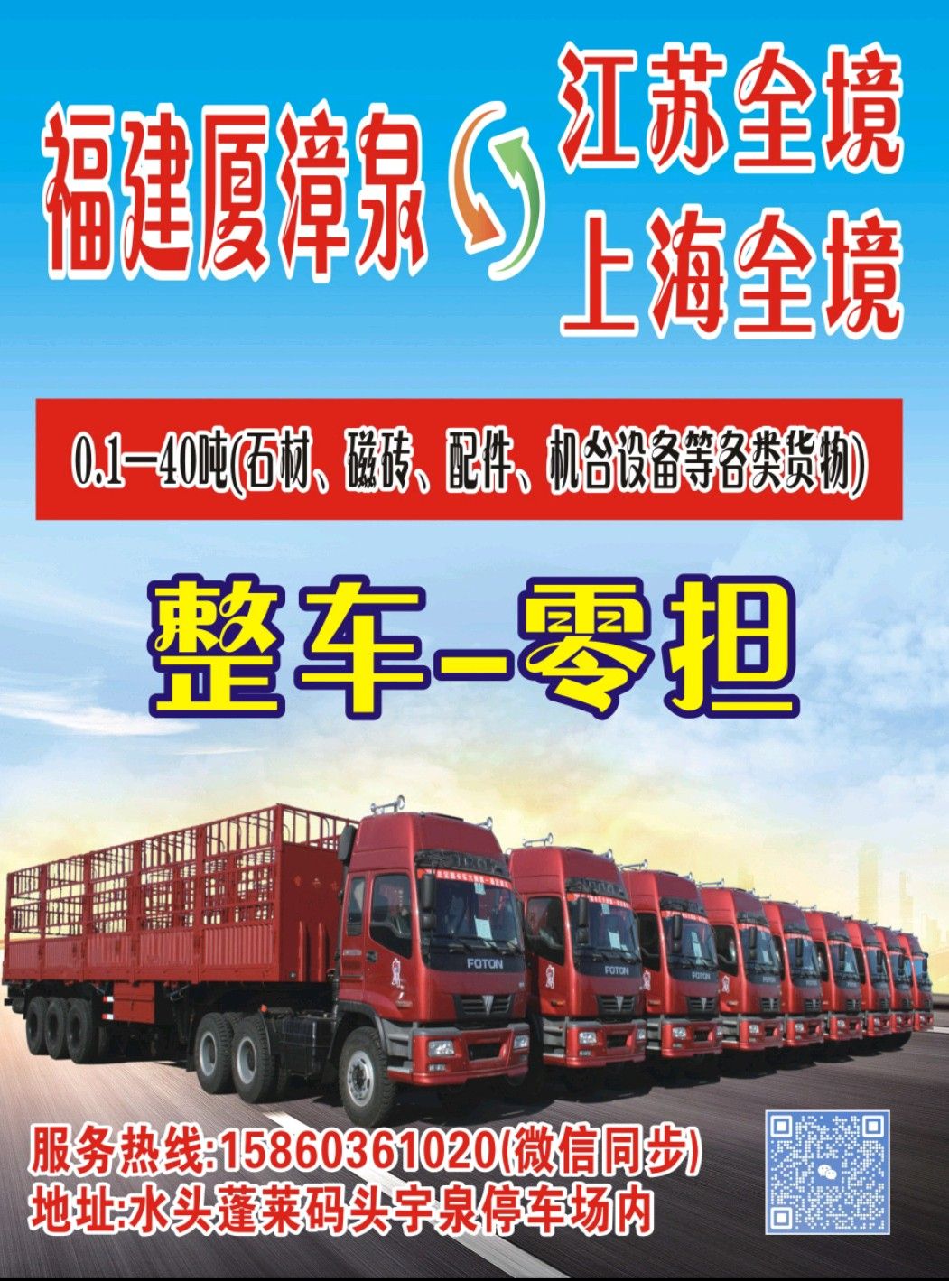 發(fā)布信息: 專業(yè)承接,廈漳泉~江蘇,浙江,上海大小貨物運(yùn)輸! [玫瑰][玫瑰][玫瑰]蘇州,無錫,常州,宜興……衢州,麗水,金華,永康,杭州~上海! 接收—整車—零擔(dān)—運(yùn)輸, 零擔(dān)可小車上門接送, 做專業(yè)的運(yùn)輸服務(wù), 本車隊均有4.2米,9.6米,13米,15米,16米,17.5米車輛, 服務(wù)熱線:15860361020