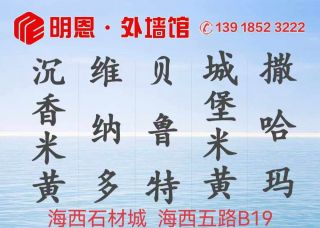 明恩石材(水頭)有限公司主營產(chǎn)品:沉香米黃,維納多,威尼斯棕,范特西,貝魯特,埃及米黃,威尼斯棕(意大利),威尼斯棕(巖板),威尼斯棕(新礦),威尼斯棕(土耳其),沉香白雪,沉香米黃(仿石磚),維納多(歐洲),埃及米黃(超白底新西米),埃及白金花,新西米,埃及貝沙金,撒哈瑪米黃,撒哈瑪(黃底),撒哈瑪(白底),溫莎城堡,城堡米黃,新城堡米黃,意大利天川金企業(yè)地址:廣東云浮中國福建南安水頭鎮(zhèn)澳盛大板市場1號(hào)路6B棟6區(qū),明恩石業(yè)